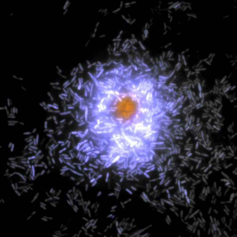 These images visualize the metabolic interaction between live bacteria and phytoplankton in the ocean. Symbiodinium cells (in orange) are single-cell, photosynthetic organisms that live in the ocean. Marine phytoplankton, such as Symbiodinium, exude metabolites into their surroundings that marine bacteria (in green and cyan) utilize as nutrients. One such Symbiodinium-derived metabolite is called DMSP (dimethylsulfoniopropionate). Phytoplankton such as Symbiodinium produce more than one billion tons of DMSP each year, and DMSP is a precursor of a gas (dimethylsulfide, or DMS) that is implicated in the formation of clouds.