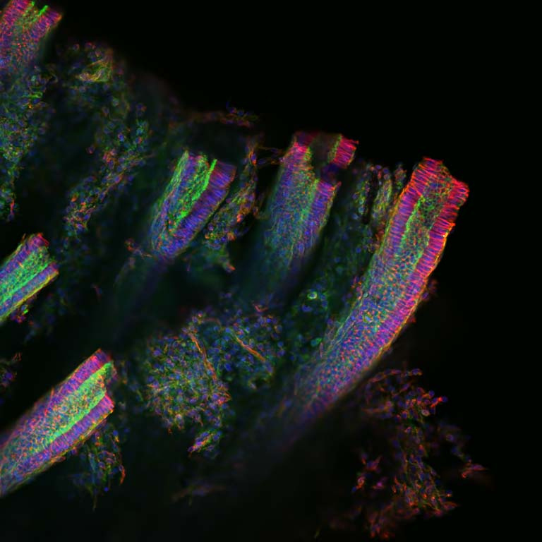 The uterus is one of the most complex and dynamic organ systems of the human body. In particular, the inner lining of the uterus, the endometrium, is responsible for the establishment of pregnancy and undergoes over 400 cycles of growth and shedding throughout a woman’s reproductive lifetime. Under the influence of hormones, such as estrogen and progesterone, it undergoes a cyclic and tightly orchestrated processes to allow embryo implantation. However, our understanding of this complex tissue’s function, as well as its reproductive diseases such as endometriosis and infertility, are poorly understood. Here, we see an endometrial gland from the in vivo human endometrium and its distinguishable columnar architecture. These images are stained for Nuclei (Dapi, Blue), Actin (Green) and Vimentin (Red).