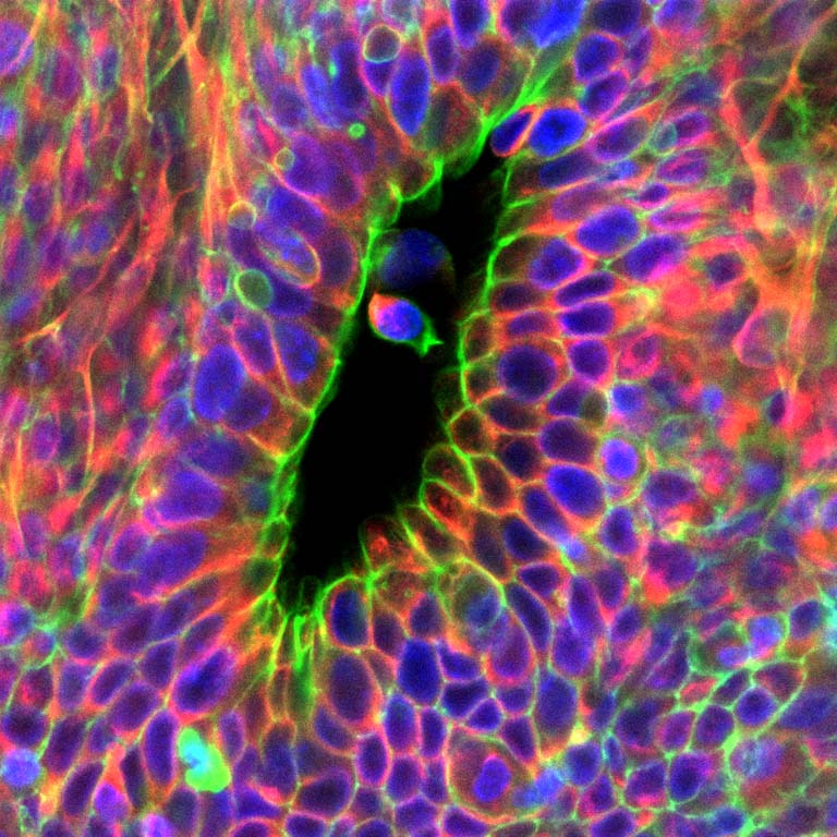 The uterus is one of the most complex and dynamic organ systems of the human body. In particular, the inner lining of the uterus, the endometrium, is responsible for the establishment of pregnancy and undergoes over 400 cycles of growth and shedding throughout a woman’s reproductive lifetime. Under the influence of hormones, such as estrogen and progesterone, it undergoes a cyclic and tightly orchestrated processes to allow embryo implantation. However, our understanding of this complex tissue’s function, as well as its reproductive diseases such as endometriosis and infertility, are poorly understood. Here, we see an endometrial gland from the in vivo human endometrium and its distinguishable columnar architecture from the top view. These images are stained for Nuclei (Dapi, Blue), Actin (Green) and Vimentin (Red).