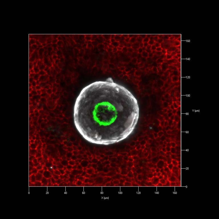 We took this image because it represented the tissue engineered endometrial glands that generated from endometrial organoids (middle image) and reached the surface to generate a connected monolayer, mimicking the glandular and luminal epithelial populations seen in vivo. The image is stained for EpCAM (red), Laminin (Lavender) and actin (Green).
