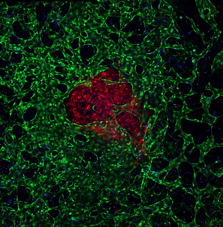 Immunotherapy is a promising method for cancer treatment, yet many elements regarding its mechanism of action still remain unknown due to traditional in vitro methods being unrepresentative of what happens in vivo. The Mechanobiology Lab develops a three-dimensional cell culture platform that recapitulates the tumor microenvironment. A breast tumor (red) is surrounded by blood vessels (in green). Immune cells (monocytes in blue and T-cells in white) have been introduced into the blood networks, with many of them remaining in the vessels. However, some immune cells have crossed the blood vessel walls and migrated toward the tumor as a result of the tumor’s molecular signals.