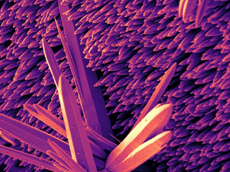 These are images of Zinc Oxide crystals. The nanoflowers are a biproduct of a reaction which grows zinc oxide nanowires on a piece of zinc metal. Zinc Oxide nanoflowers are one of the many kinds of Zinc Oxide nanostructures that can be synthesized.