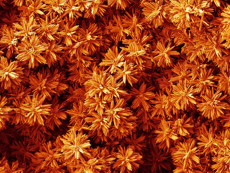 These are images of Zinc Oxide crystals. The nanoflowers are a biproduct of a reaction which grows zinc oxide nanowires on a piece of zinc metal. Zinc Oxide nanoflowers are one of the many kinds of Zinc Oxide nanostructures that can be synthesized.