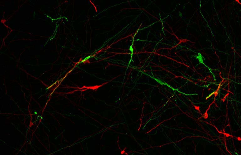 This image shows neurons derived from stem cells generated from of the skin cells of autistic patients and control neurons, generated from the same stem cells where the mutation responsible for the disease was corrected using CRISPR. This project aims at studying alterations in the development of neurons from Fragile X patients growing in an in vivo context. I took this image to assess the morphological differences between neurons from autistic patients and control neurons, in order to determine whether the maturation of these neurons is perturbed.