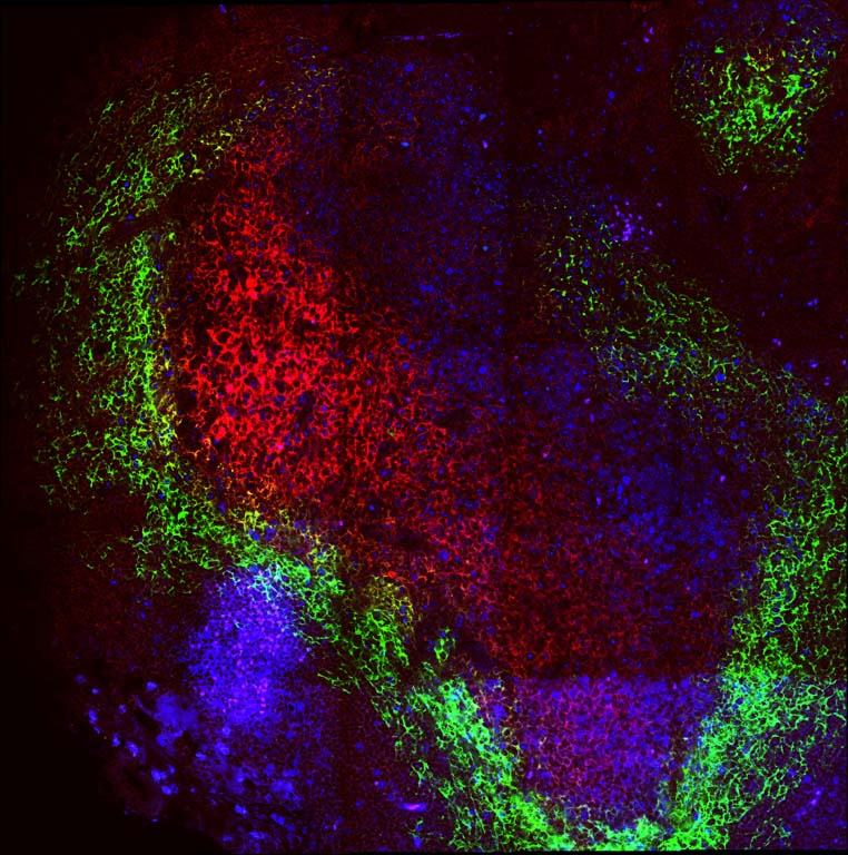 This image shows an organ of the immune system in the process of responding to a new type of HIV vaccine. The cyan/green color is the vaccine, and the red indicates cells that collect information for further use. The blue color are the cells that are in the process of making antibodies that attach to the vaccine.