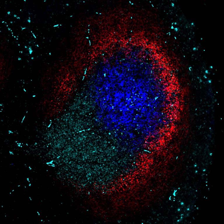 This image shows a close-up from an organ of the immune system in the process of responding to a new type of HIV vaccine. The red color is the vaccine, and the blue indicates cells that collect information for further use. The cyan color are the cells that are in the process of making antibodies that attach to the vaccine.