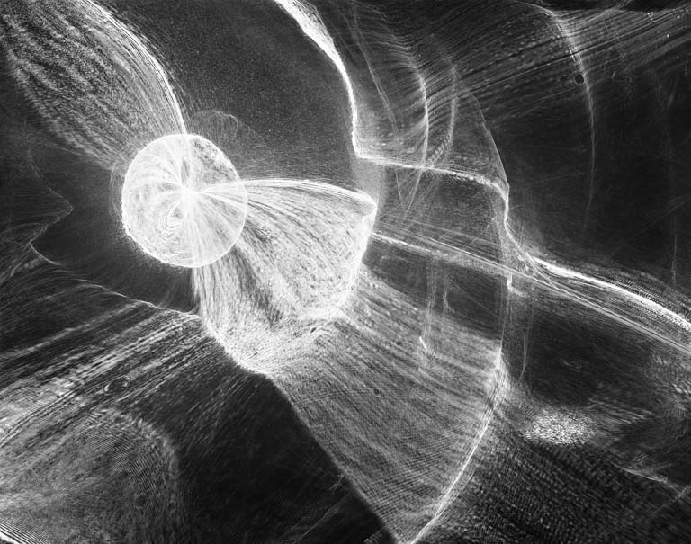 The irradiations in this project are an aesthetic investigation into the wave-nature of light. They reveal in them the ways in which photons can behave not just as particles but also as waves which can interfere. These images where created by shining laser beam through blown glass optics which then refract, internally reflect, and diffract the light outwards into the forms that you see. That light is then captured on 8x10 inch film which is developed and scanned to yield the images you see.