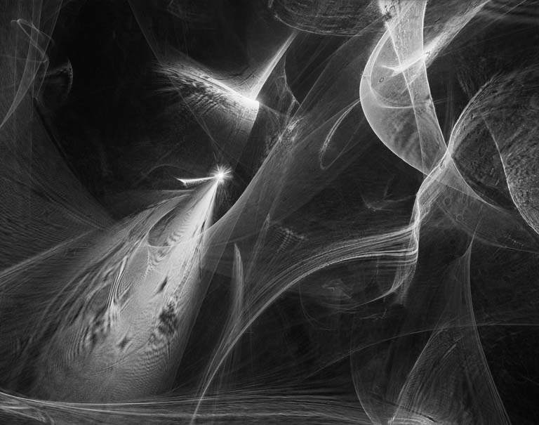 The irradiations in this project are an aesthetic investigation into the wave-nature of light. They reveal in them the ways in which photons can behave not just as particles but also as waves which can interfere. These images where created by shining laser beam through blown glass optics which then refract, internally reflect, and diffract the light outwards into the forms that you see. That light is then captured on 8x10 inch film which is developed and scanned to yield the images you see.