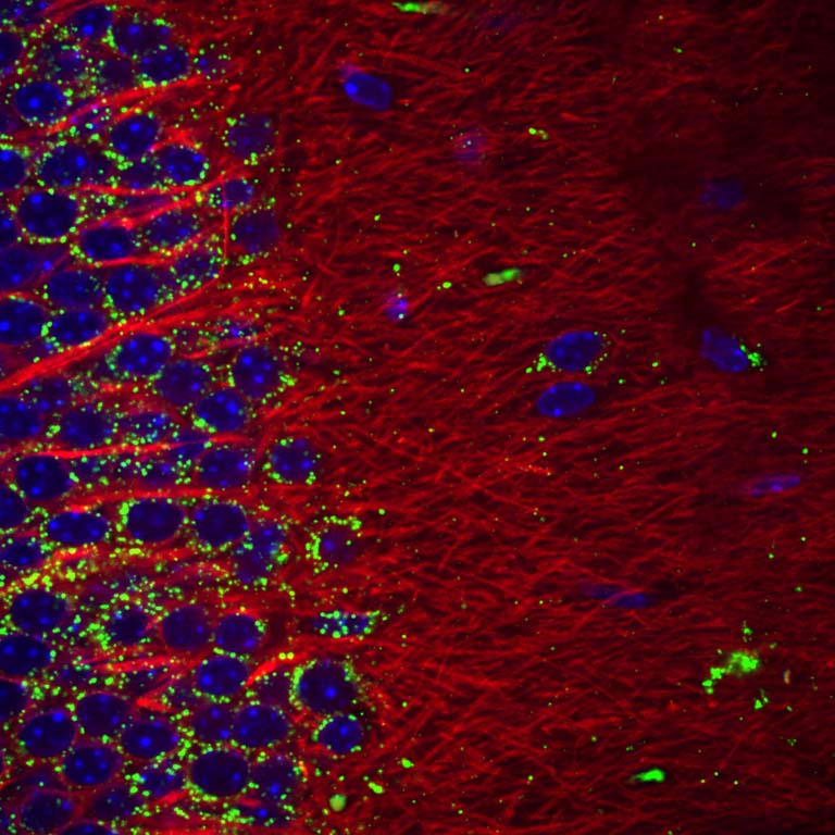 This image shows lysosomes in neurons in the brain of a mouse. The red color shows the structure and projections of these neurons, the blue color indicates their nuclei and the green indicates the lysosomes. The lysosome is an important cellular compartment that acts as a degradation center and a signaling hub that regulates important aspects of cellular physiology.