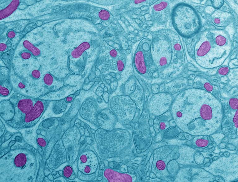 Mitochondrion is a cellular compartment that carries out crucial functions for cellular and organismal health. It produces energy powering the cell and is also an important signaling hub that controls many important cellular decisions. In this image we look into the ultrastructure of mitochondria in the brain of a young mouse. We are able to zoom into the tissue very closely and see multiple mitochondria within cells and cellular projections at high magnification allowing us to clearly observe the beautiful and unique aspects of mitochondrial organization.