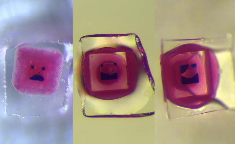 This image shows hollow core-shell microparticles for long-term antigen delivery for vaccination and cancer immunotherapy. The images show distribution of dye (blue) inside the core of a cubic microparticle. Particles are made from biocompatible polymers (PLGA) and are almost half a millimeter. These particles have a cap-base structure. The cap contains a red fluorescent component making it look red. A secondary fluorescent dye (blue) is encapsulated inside the cap. Dye distribution over incubation (interaction with water) has made smile faces--sad to happy to excited, from left to right (showing what a grad student goes through from submission to acceptance of a paper!!)