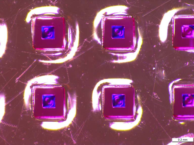 This image shows a fluorescent dye (blue) incorporated into small hollow particles for controlled delivery of vaccines and cancer treatments. These particles have a core-shell structure formed when a cap and base (incorporating the core) layers are fused together. The microparticle itself has a red fluorescent cap that is transparent. Thus, the blue dye is visible inside the particle from the top.