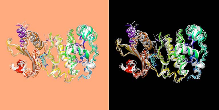 In this picture using molecular dynamics and simulations taken from experimental data we confirm how the drug (in yellow) is binding onto this human protein called JNK1 directly. This is the first time a drug has been found that is able to bind and effect this protein pivotal for cell survival in cancers.