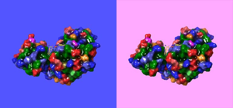 In this picture using molecular dynamics and simulations taken from experimental data we confirm how the drug (in yellow) is binding onto this human protein called JNK1 directly. This is the first time a drug has been found that is able to bind and effect this protein pivotal for cell survival in cancers.