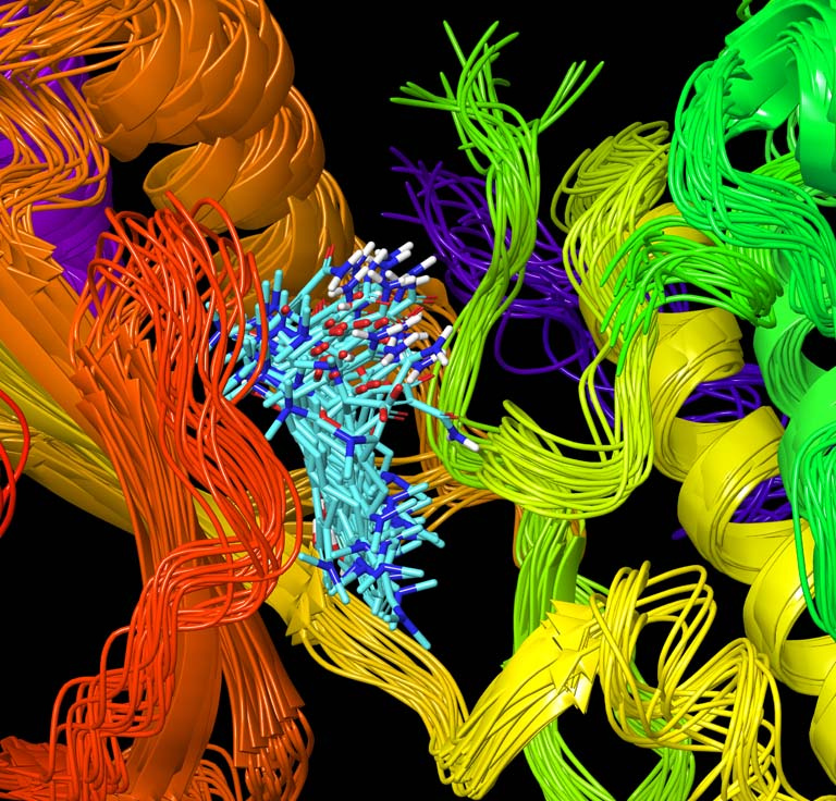 In this picture using molecular dynamics and simulations taken from experimental data we confirm how the drug (in yellow) is binding onto this human protein called JNK1 directly. This is the first time a drug has been found that is able to bind and effect this protein pivotal for cell survival in cancers.