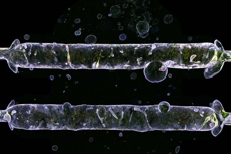 Using tiny technologies, we can engineer micro-devices that allows one to orient cells in their native architecture. Here we have two parallel channels within a natural material that mimics the human body, lined biliary epithelial cells, re-creating the features of the biliary conduit in the liver, which is responsible for transporting bile acid. This image represents one of only several demonstrations of an engineered in vitro bile duct, having potential to study the mechanism of flow in biliary homeostasis and cancer.
