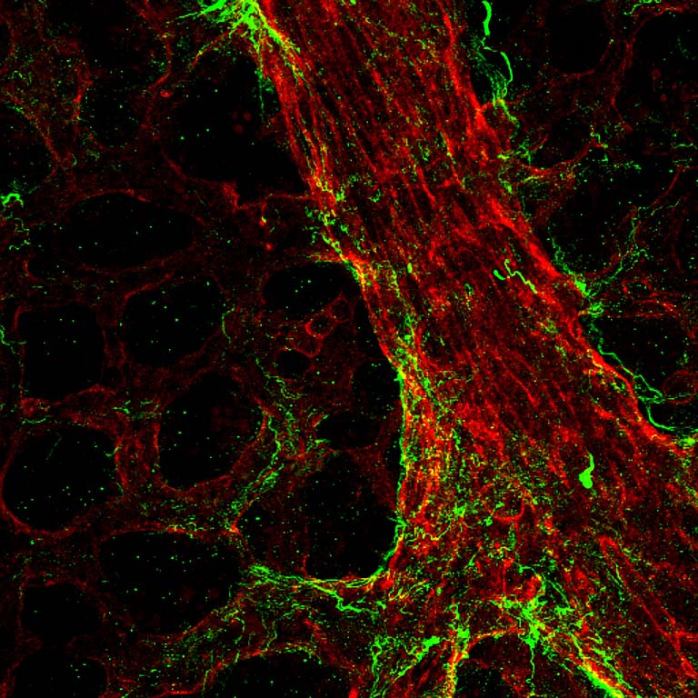 In the images are developing vascular network (red) in the mouse yolk sac and an extracellular matrix protein named tenascin-R that is expressed along these vessels (green). Here, a remodeled and large vessel is pictured, overlaying a network of immature vessels.