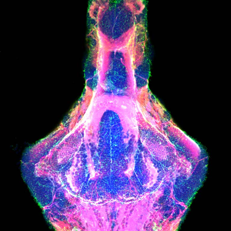 This is an image of an adolescent zebrafish brain. We are comparing normal to mutant brains. Mutant brains showed ectopic staining of a synaptic protein. These experiments help us understand what the developing brain should look like and how our mutant brains differ. The SHIELD preservation and clearing of the brain, not yet performed on zebrafish tissue, keeps tissue beautifully intact and allows imaging of whole brains without need of sectioning.