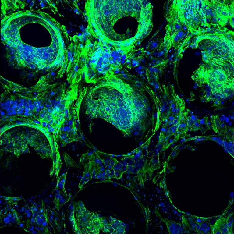 Growing healthy, physiologically relevant liver tissue in the lab will allow us to utilize it for a wide range of biomedical applications. In this proof-of-concept experiment, we demonstrate that fresh liver cells isolated from rats can form beautiful tissues inside the bioreactor and last for 1 week; these sensitive cells would not be nearly as robust in a traditional culture format. In this image, the rat cells are visualized by staining their nuclei (blue, DAPI) and their cellular filaments (green, phalloidin).
