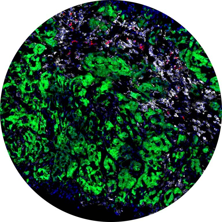 This image shows high magnification fluorescence confocal microscopy of a mouse colon adenocarcinoma (green) infiltrated by cytotoxic CD8+ T cells (white*), with tumor-specific CD8+ T cells additionally highlighted (red*). Nuclei mark live cells (blue*).
