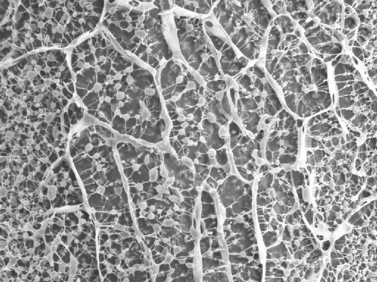 This image shows the interior structure of a hydrogel at nanoscale. This material was designed to deliver drugs in a targeted way to inflamed regions in the human gut. The network of nano-sized particles with thread-like connections makes it look like “grapes on a vine”; this potentially mimics the mucus network in healthy mucosa and protects the gut.