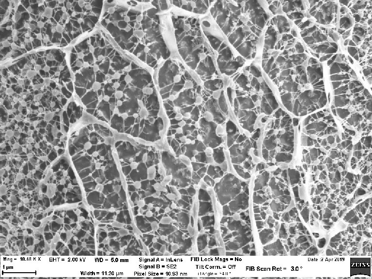 This image shows the interior structure of a hydrogel at nanoscale. This material was designed to deliver drugs in a targeted way to inflamed regions in the human gut. The network of nano-sized particles with thread-like connections makes it look like “grapes on a vine”; this potentially mimics the mucus network in healthy mucosa and protects the gut.