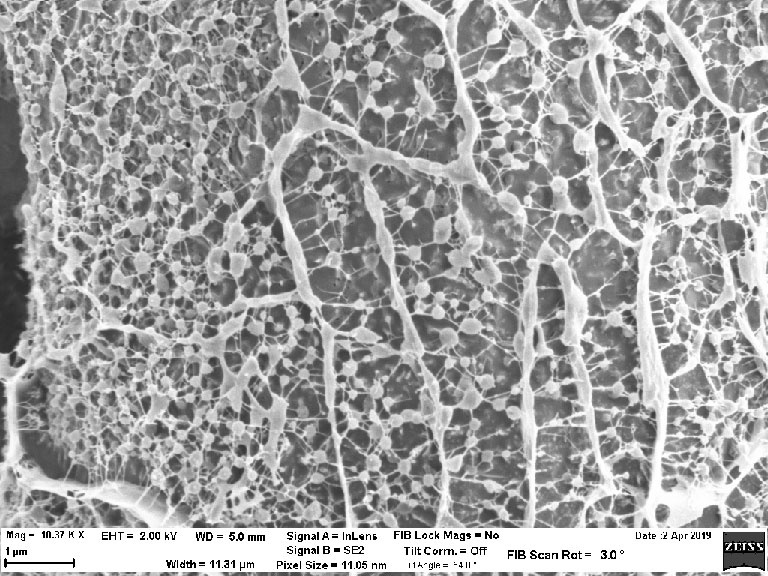 This image shows the interior structure of a hydrogel at nanoscale. This material was designed to deliver drugs in a targeted way to inflamed regions in the human gut. The network of nano-sized particles with thread-like connections makes it look like “grapes on a vine”; this potentially mimics the mucus network in healthy mucosa and protects the gut.