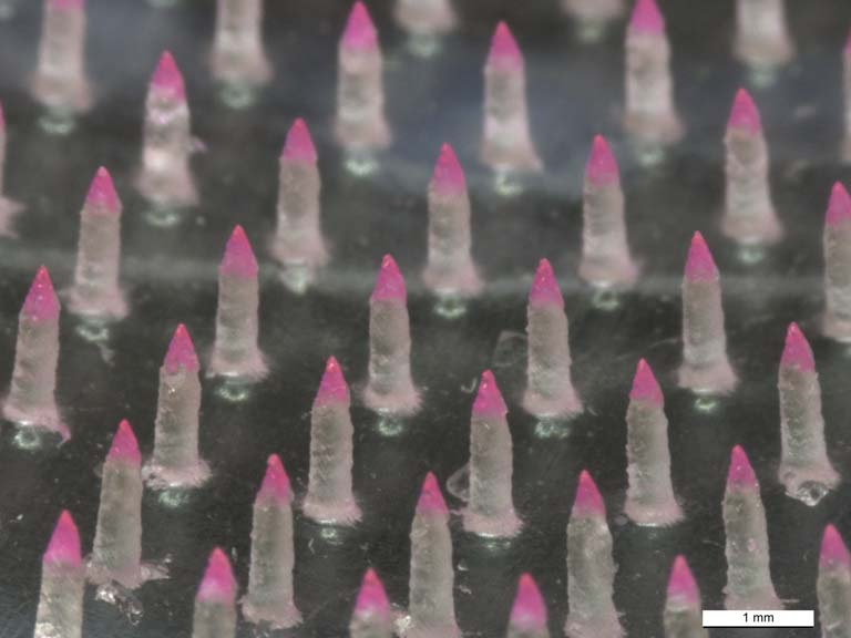 This single dose skin patch is applied once to achieve long acting (~ 6 month) and discrete (visibly undetectable) contraception. The tips of the microneedles, visualized here using a pink dye, detach from the remaining patch and lodge with minimal invasiveness beneath the user’s skin. They contain a biodegradable slow release contraceptive offering up to 6 months duration. This empowers women particularly in low resource settings, who have infrequent access to healthcare and require both self-administrable and culturally sensitive (e.g. discrete) contraceptive options.