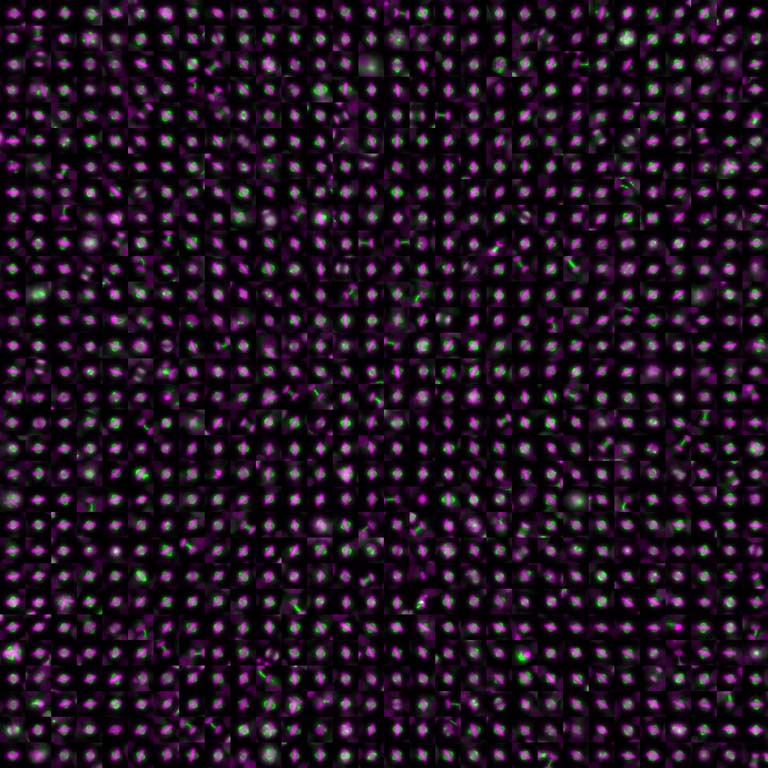This is a composite image from the same dataset in image 1, here extracting cells in mitosis from many different images and combining them into a single “montage.” This demonstrates the variety of defects observed in mitosis in this dataset, as well as the scale of the dataset. For thousands of different gene knockouts, hundreds of mitotic cells were identified and analyzed.