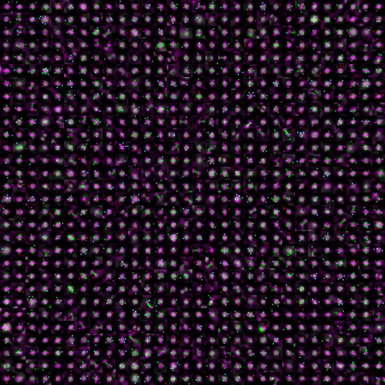 This is the same image as image 2, except here adding in the colored DNA barcode spots demonstrating the “reading” of barcodes to identify which cell had which gene knocked out.