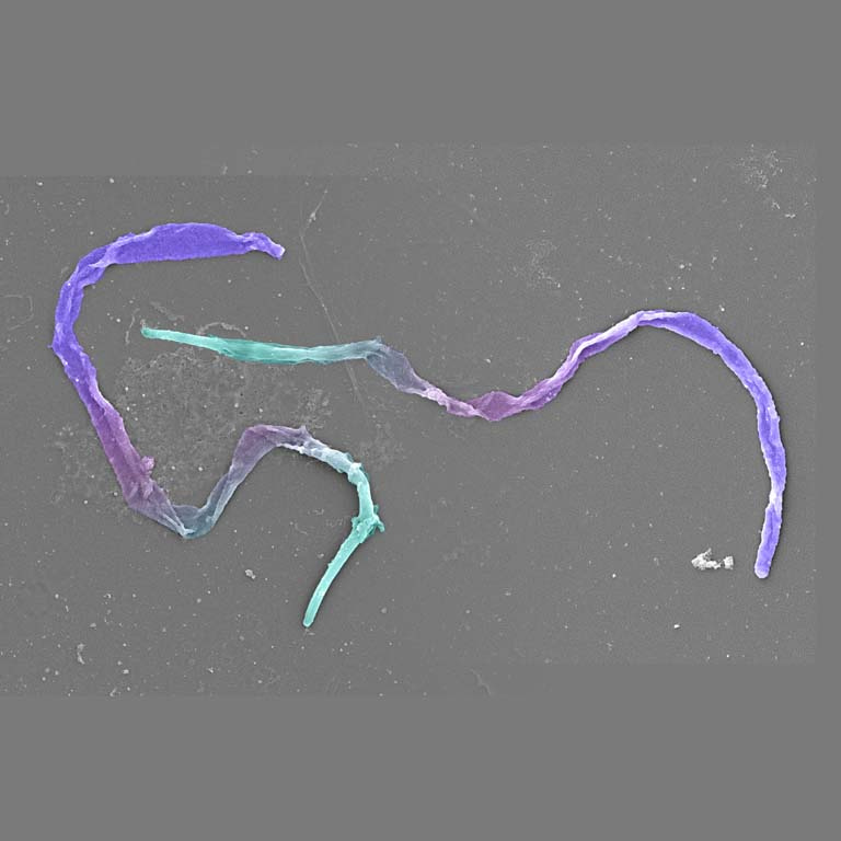 The image captures a malaria parasite with its outer protein coat being stripped as a result of antibodies binding. When antibodies bind to this coat protein on the surface of the malaria parasite, they cross-link the protein, which induces the shedding of the outer surface coat. Similar to a snake shedding its skin, the coat forms a hollow structure which collects at the posterior (back) end of the parasite. The image was taken to gain understanding of the mechanisms underlying parasite-host interactions.