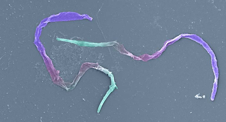 The image captures a malaria parasite with its outer protein coat being stripped as a result of antibodies binding. When antibodies bind to this coat protein on the surface of the malaria parasite, they cross-link the protein, which induces the shedding of the outer surface coat. Similar to a snake shedding its skin, the coat forms a hollow structure which collects at the posterior (back) end of the parasite. The image was taken to gain understanding of the mechanisms underlying parasite-host interactions.