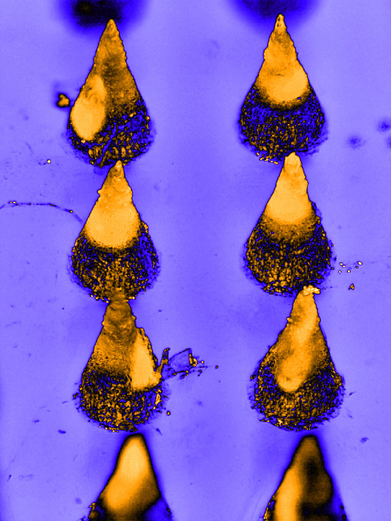 The microneedle structure must be strong enough to penetrate the skin, but also having a porous enough structure that will allow cells to migrate inside. In the images it can be seen how the tip of the needles has a lower porosity and stronger mechanical properties while the lower regions display a much higher porosity.