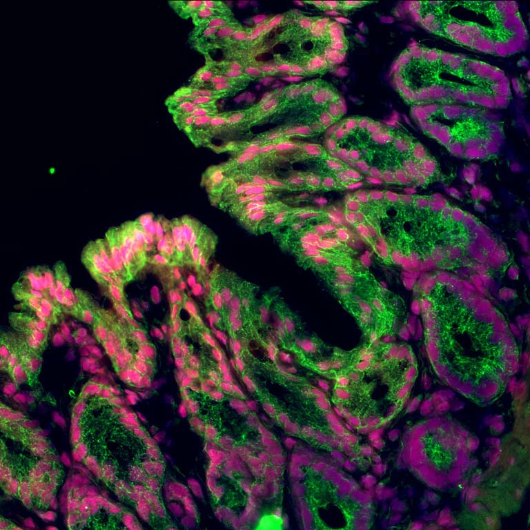Enzymes play critical roles in health and disease. In cancer, enzymes called proteases help tumor cells escape and invade by degrading the surrounding tissue matrix. In order to understand how proteases aid in cancer progression, it’s important to be able to visualize where these enzymes are active. The Bhatia Lab has developed chemical probes that can measure and localize protease activity within tissue sections. To validate our approach, we first applied our probes to the colon, in which proteases play important roles under normal, healthy conditions. Here, we found that our protease-activity probe (red) selectively labeled certain types of cells in the colon called “epithelial cells”, which are dyed in green. These probes could lead to new insights into how proteases produced by epithelial cells contribute to intestinal health and disease, and may also be applied more broadly in other diseases, like cancer, in which protease activity is important.