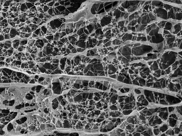 This image shows the interior structure of a hydrogel at nanoscale. This material was designed to deliver drugs in a targeted way to the inflamed regions in human gut. The nano-sized particles with thread-like connections form a network looking like “grapes on a vine”; this could potentially be used for drug delivery and mimicking the mucus network in the gut mucosa.