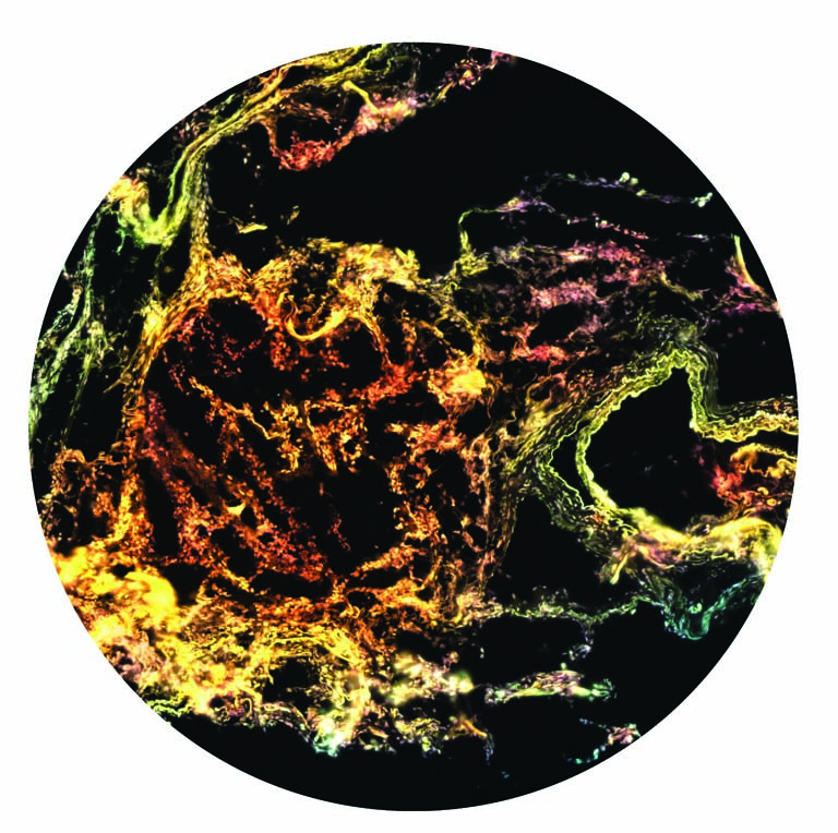 Both of these images show human lung tissue that has been stained with activatable zymography probes (AZPs). These probes are designed to mark sites of protease cleavage with a fluorescent label. Because proteases, which are enzymes, are involved in a wide range of biological processes, these probes can be used to detect areas of upregulated biological activity, which is a hallmark of cancer and other diseases. Here, the probes are detecting pulmonary protease activity. By using AZPs to localize protease activity, we can learn about the biological processes underlying disease, and even create new methods to diagnose diseases from tissue samples.