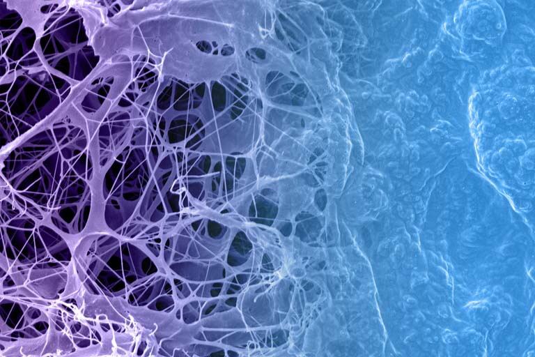 The controlled, localized delivery of a wide range of drugs (small molecules, proteins, nucleic acids) can be critical for a therapeutic’s effects but can also pose many technical challenges. We were particularly interested in loading therapies onto a biodegradable scaffold that could be placed directly on a slow-healing wound to speed healing. To do this, we assembled species of opposite charges -including our therapy - into a thin coating on biodegradable dressings. The left side of this image is the uncoated dressing, while the right side shows the coated dressing.