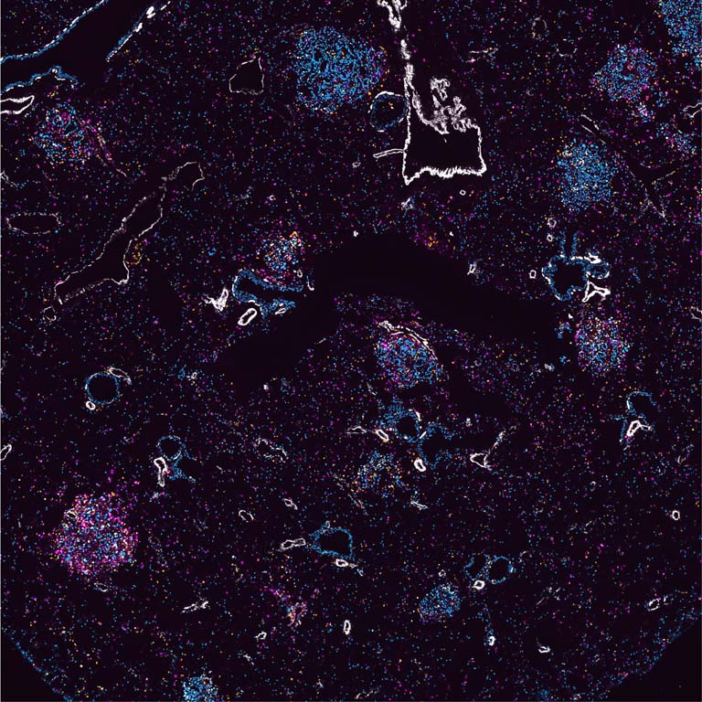 This image depicts the immune response against multiple tumor lesions in the lung of a mouse. We use this mouse model of cancer to better understand how we can improve the immune response to tumors therapeutically. In this study, we found that a therapeutic vaccine targeting certain proteins in the cancer cells drove a strong immune response against the tumors. We observed greater numbers of killer T cells (marked by magenta and orange) inside the tumors (round circles) and these cells significantly shrank the tumors. These findings identify a new vaccine approach to treating cancer that could be trialed in human patients.