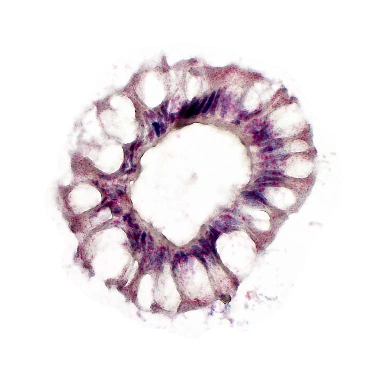 This is staining of COVID-19 (SARS CoV-2 virus) in situ hybridization directly infecting a human colon crypt. This is evidence we used to publish our recent findings that COVID-19 can in fact directly infect the cells in our gut leading to gut symptoms as well as a significant increase in mortality. The red dots are the viral mRNA.
