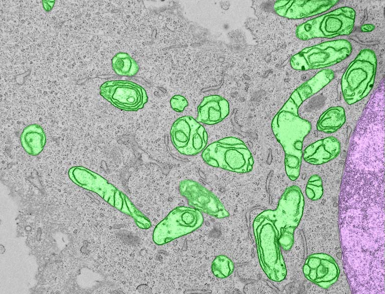 Mitochondria in our cells are like bacteria because they contain their own DNA, which they need to convert our food to energy, but we can remove this DNA to study their other functions. These mitochondria have unusual “onion” morphology because we have removed their DNA.