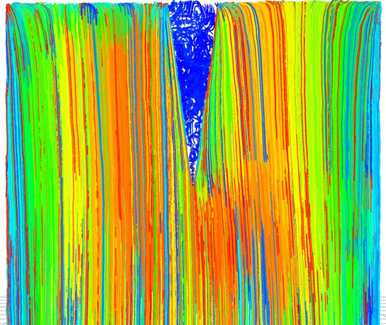 We are 3D printing SARS-COVID-19 vaccine microneedle patches. This image shows a CFD simulation of a microneedle forming in a PDMS mold. Air is being pulled into the semi-permeable PDMS mold by a negative pressure suction while polymer flows into a cavity to form a semi-conical microneedle. Each air and fluid particle is identified and represented in different color path lines. I took this image to investigate microneedle formation behavior and predict polymer loading time.