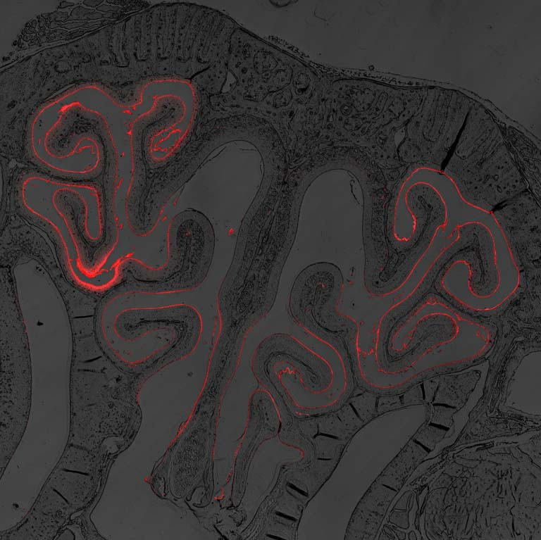 The vaccine was labeled with a fluorescent molecule so it could be visualized by microscopy. In these images, the signal of the vaccine (in bright yellow to red) can be seen lining the textured nasal tissue (gray/blue) against the intricate architecture of the nasal cavity (background and negative space).