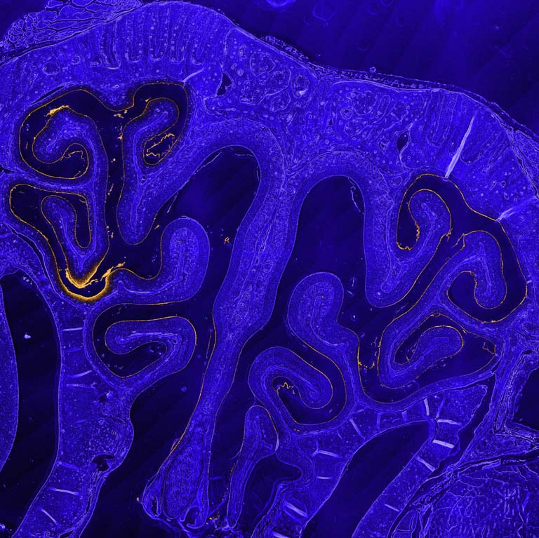 The vaccine was labeled with a fluorescent molecule so it could be visualized by microscopy. In these images, the signal of the vaccine (in bright yellow) can be seen lining the textured nasal tissue (blue) against the intricate architecture of the nasal cavity (background and negative space).