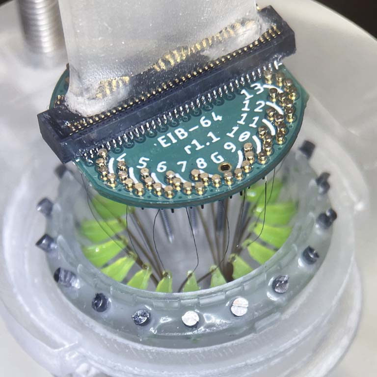 This small device, micro-drive, carrying multiple tiny electrodes enables us to record the activity of the hundreds of neurons in freely behaving animal’s brain. With this technology, we can “listen” the dialogues of neurons across multiple brain regions and investigate the function of brain.