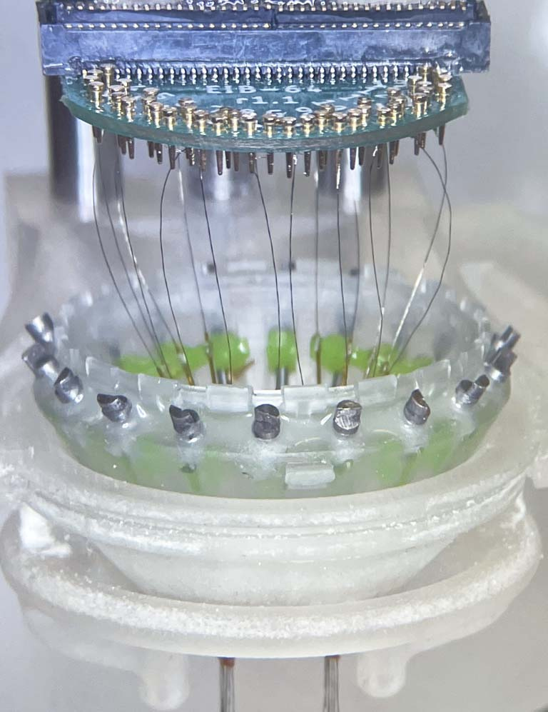 This small device, micro-drive, carrying multiple tiny electrodes enables us to record the activity of the hundreds of neurons in freely behaving animal’s brain. With this technology, we can “listen” the dialogues of neurons across multiple brain regions and investigate the function of brain.