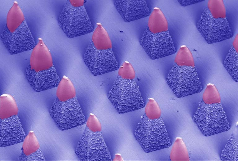 The current intradermal injections require skilled personnel to administer them, and even then, delivery efficiency is about only 30%. By switching from intradermal injections to a quickly applied microneedle patch, we aim to simplify the process while increasing the precision. Our microneedle patches can be coated with peptides and used for noninvasive, environmentally-friendly diagnosis of cancer (e.g. ovarian cancer), infectious disease (e.g. Tuberculosis), and autoimmunity (e.g. Lupus). In this case, our image shows microneedle skin patches coated with PPD, a peptide cocktail routinely used in clinics for skin-based diagnosis of Mycobacterium tuberculosis infection, the most endemic global pathogen, infecting one third of the population and remains the second leading cause of death from a single infectious agent, after HIV.