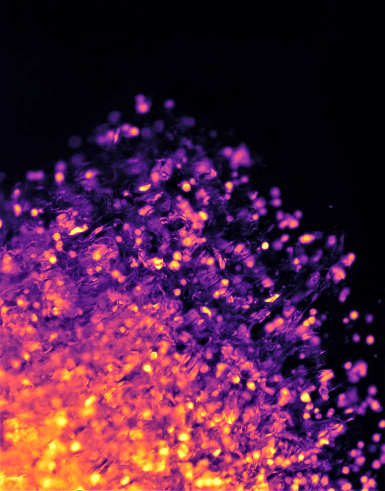 This image displays an implantable living pharmacy wherein implanted cells absorb nutrients from the patient’s body and in turn secrete therapeutics such as insulin for diabetes. The implant comprises cells (glowing dots) dispersed within the pores of a novel spongey material. The sponge is specially engineered to rapidly percolate oxygen throughout the entire structure, like how air ducts deliver air to different rooms in a building. This enhanced oxygen supply throughout the implant can support a higher density of healthy cells by reducing competition for limited nutrients, effectively reducing the surgical footprint.