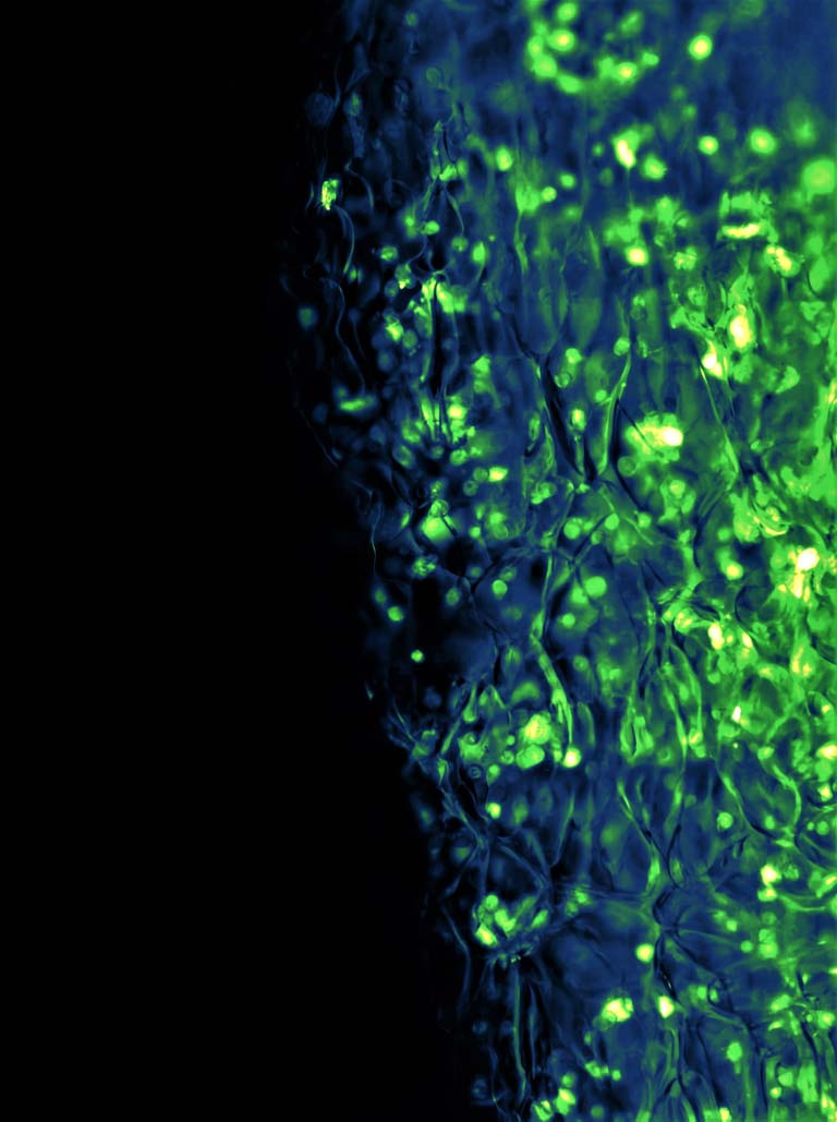 This image displays an implantable living pharmacy wherein implanted cells absorb nutrients from the patient’s body and in turn secrete therapeutics such as insulin for diabetes. The implant comprises cells (glowing dots) dispersed within the pores of a novel spongey material. The sponge is specially engineered to rapidly percolate oxygen throughout the entire structure, like how air ducts deliver air to different rooms in a building. This enhanced oxygen supply throughout the implant can support a higher density of healthy cells by reducing competition for limited nutrients, effectively reducing the surgical footprint.