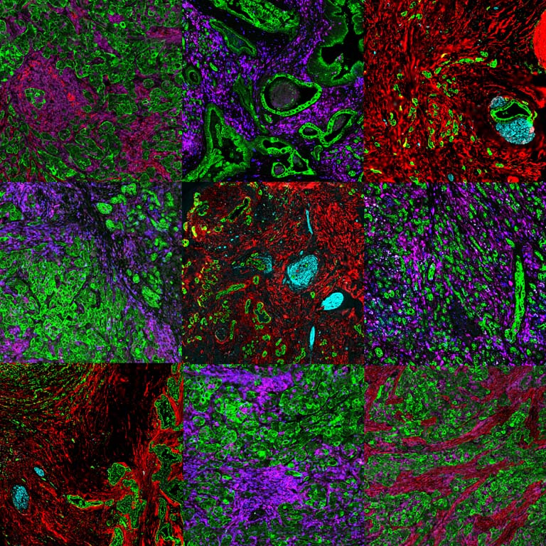 This image displays the tumor microenvironment of human pancreatic ductal adenocarcinoma (PDAC), the most common form of pancreatic cancer and the third most frequent cause of cancer-related deaths in the United States. By independently staining different cell types in the tumor microenvironment, we are able separately interrogate the detailed cell types and states to discover distinct multicellular communities and intercellular interactions.