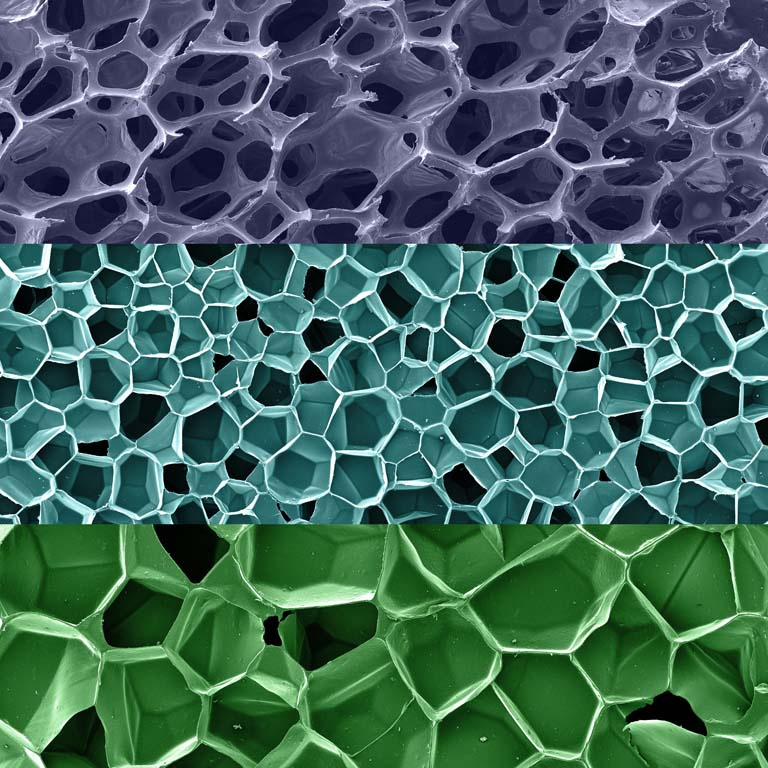 These are anti-static foams used to detect mechanical pressure. We want to understand the microstructure of the foam to understand how it reflects mechanical pressure into resistance change. The porous structure verifies the hypothesis that the reduction of resistance upon a mechanical pressure applied is due to the creation of more contacting points in the material.